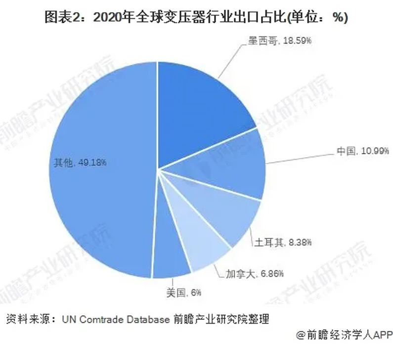 從全球變壓器出口占比來看,由于變壓器屬于技術密集型產業,市場集中度高,生產各類變壓器的企業大多集中在墨西哥、加拿大等國家,排名前五的國家占據出口額的一半以上。由于我國變壓器產品我國占比第二,達到10.99%。排名前五的國家還有墨西哥、土耳其、加拿大和美國,占比分別為18.59%、8.38%、6.86%和6%。
