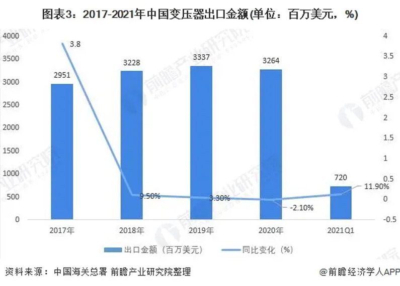 由于我國變壓器產量高,產能過剩,行業發展較好。2017-2020年,我國變壓器出口金額基本維持平穩增長態勢。2021年第一季度,隨著全球新冠疫情影響的減弱,出口金額同比增長11.9%。同時,2021年我國出臺《變壓器能效提升計劃(2021-2023年)》,預計變壓器產能將進一步提升,出口金額預計將隨之增長,出口比例將進一步提升。