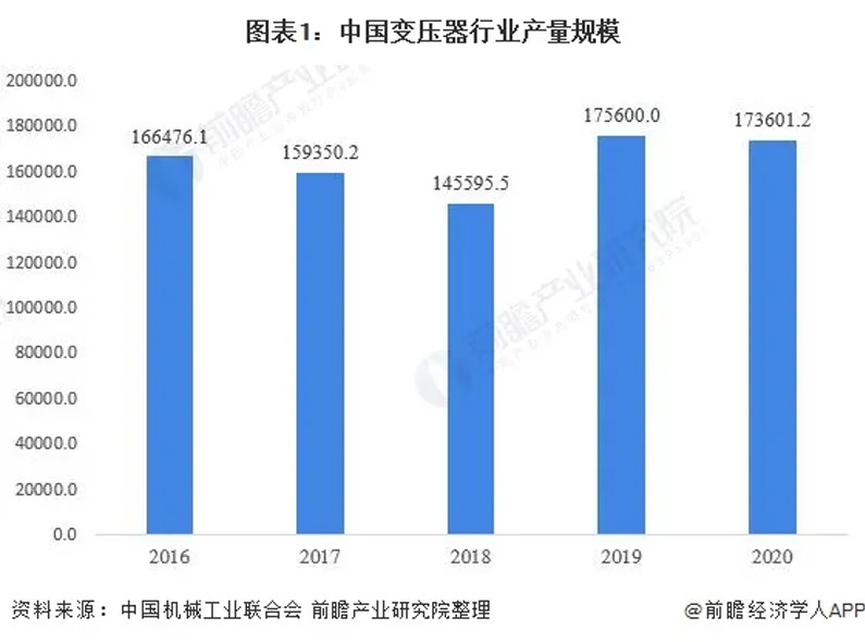 2016-2018年,受輸配電價格下降及產品浪費嚴重等問題的影響,隨著市場需求量的相對飽和及轉變變壓器產量小幅減少。2019年,我國變壓器總產量規模有所回升,整體規模達到175600萬千安伏,同比增長20.6%。2020年,受新冠疫情影響,我國變壓器總產量規模略微下降,降至173601.2萬千安伏,但較之前年份有所回升。